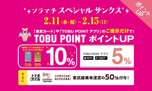 東武カードのご提示で10%、TOBU POINTアプリご提示で5%にポイントアップします!