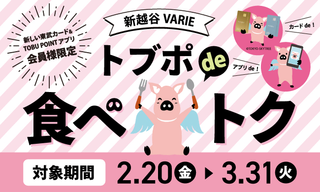 新越谷ヴァリエの対象飲食店舗にて、キャンペーン期間中、新しい東武カード、もしくはTOBU POINTアプリキャンペーンページ画面を注文時にご提示いただくと、お得なサービスが受けられます!