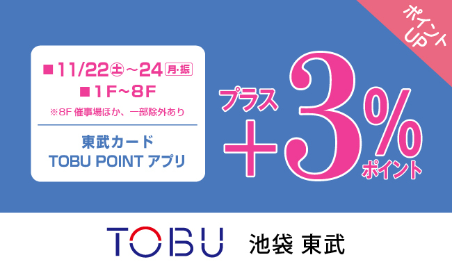 期間中、東武カード・TOBU POINTアプリでのお買物で+3%ポイントとなります。