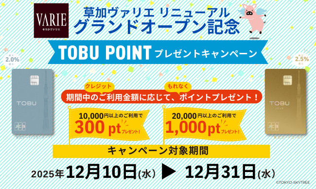 期間中の草加ヴァリエでの東武カード(※1)のクレジットご利用合計金額に応じて、もれなくTOBU POINT最大1,000ptプレゼント!