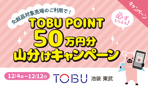 期間中、対象売場にてTOBU POINTアプリまたは、TOBU POINTアプリに登録した東武カードをご呈示のうえ、累計5,000円(税抜)以上お買上げいただいた方全員でTOBU POINT 50万ptを山分けプレゼントいたします。